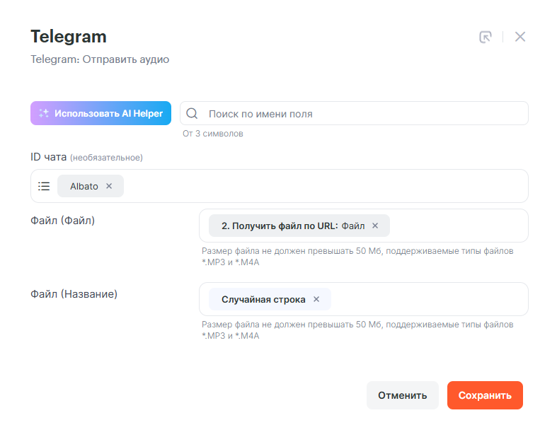 В настройках выберем тот же ID чата, который был выбран в действии Telegram: Отправить сообщение. В поле Файл (Файл) добавим переменную — Файл из шага HTTP запрос, а в качестве названия можете указать своё. В примере будет выбрана случайная строка из системных настроек.