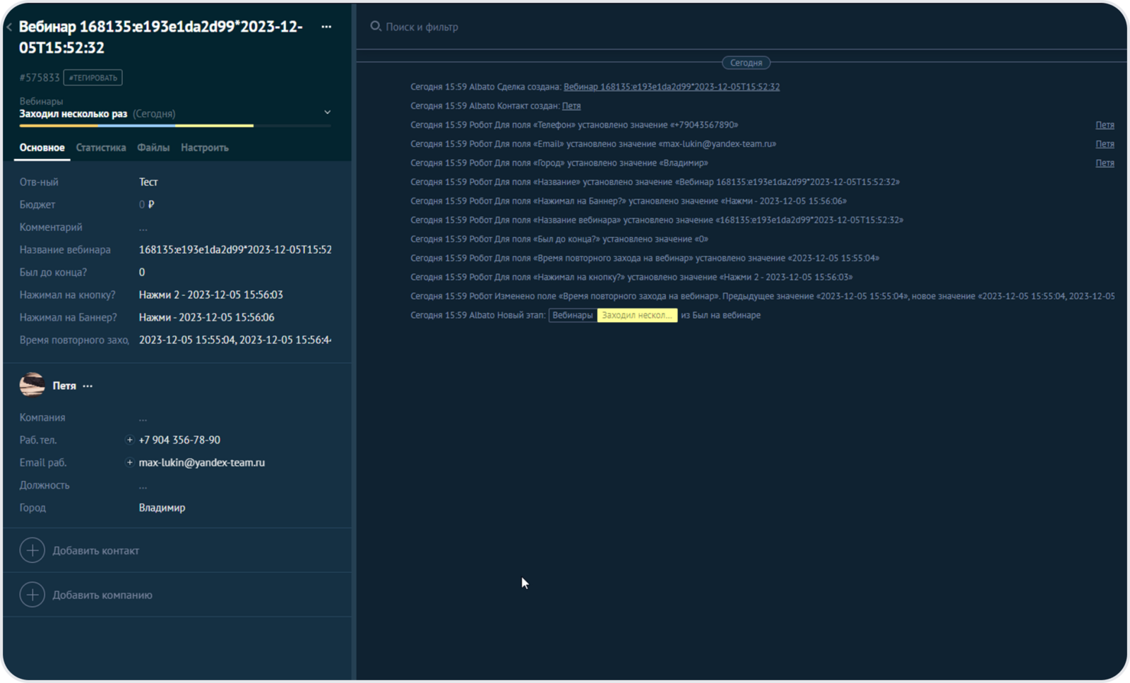 После завершения вебинара, мы получили следующие данные: один слушатель выходил из вебинара, карточка сделки была обновлена в amoCRM, статус в сделке изменился, дата и время повторного захода на вебинар так же добавилась в карточку сделки.