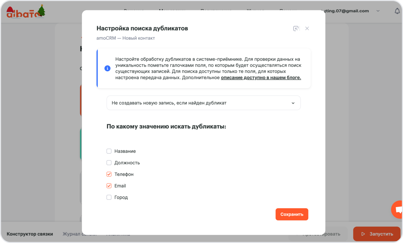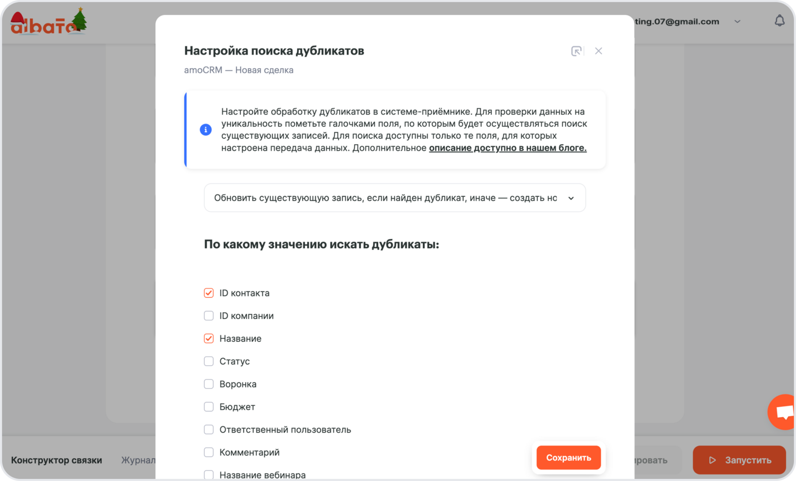 Далее откроется окно Настройки поиска дубликатов. Из выпадающего списка выбери Обновить существующую запись, если найден дубликат, иначе – создать новую запись и выбери значения по которому система будет искать дубликаты.