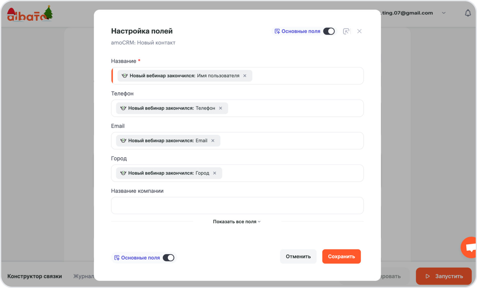 В данном окне все поля заполнены системным параметром – Текущее значение, которое оставляет существующие данные в поле карточки amoCRM без изменений.