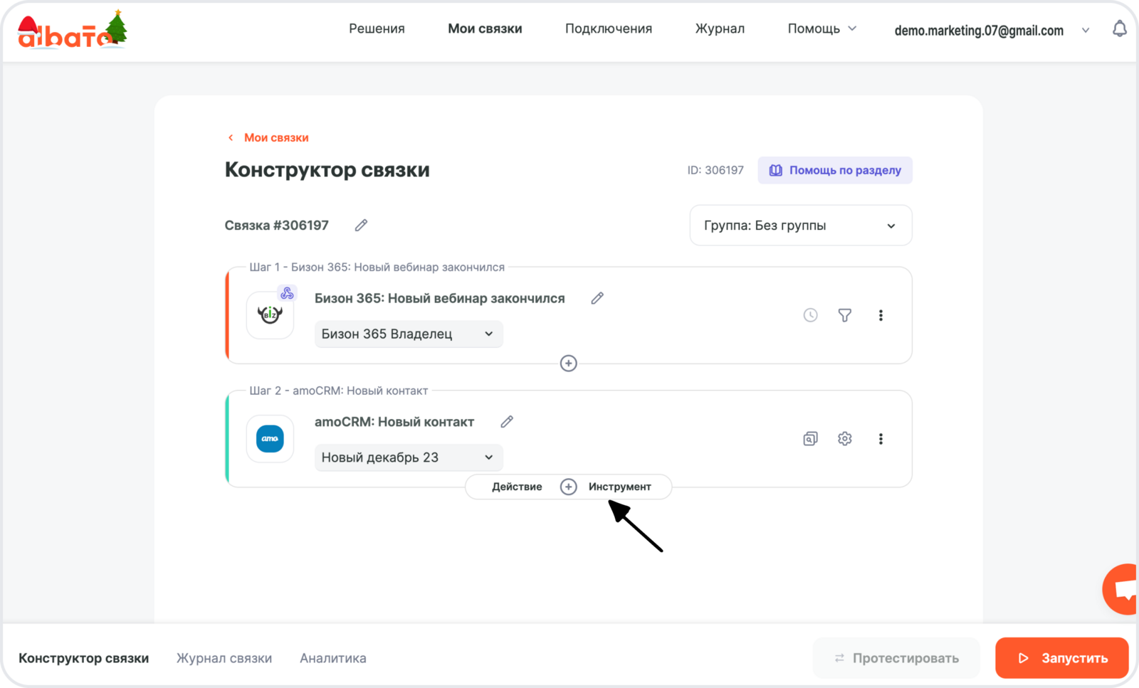 • Какое действие выполнить, когда запустится связка — Новый контакт.