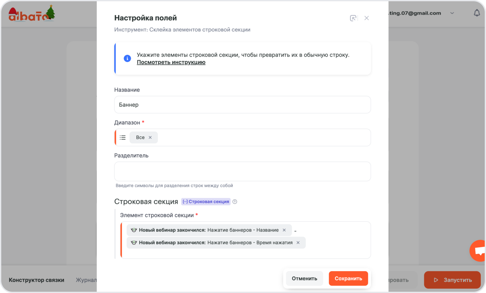Предположим, что в интеграции необходимо передавать факт нажатия на кнопки и на баннеры, для этого в связку нужно добавить два инструмента – Склейка элементов строковых секций, так как эти данные приходят массивом.
