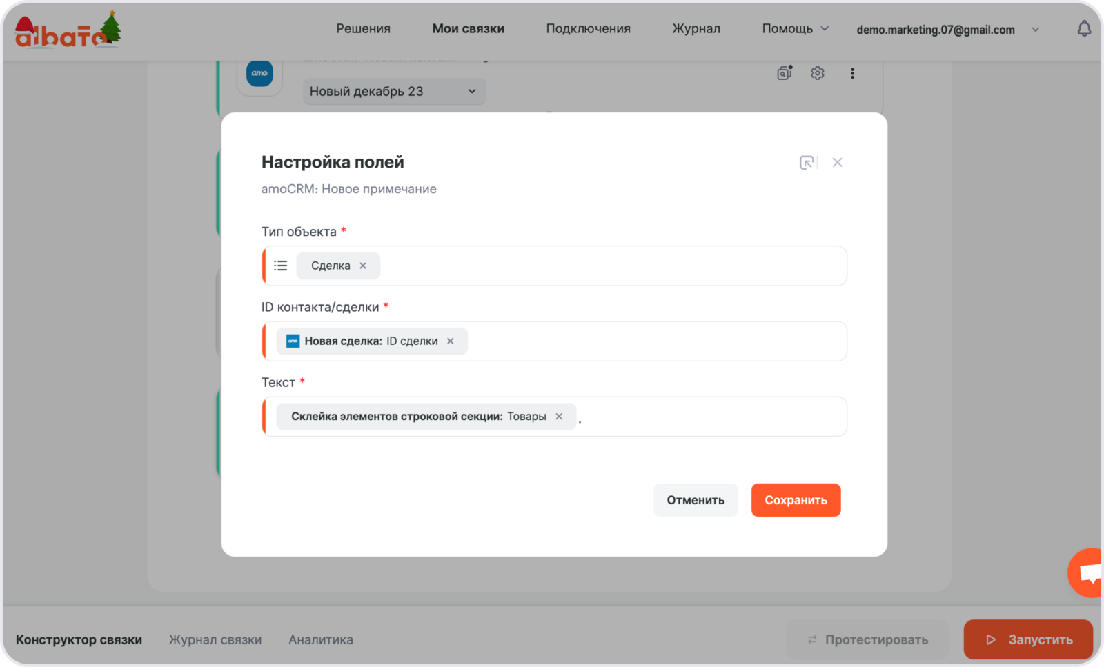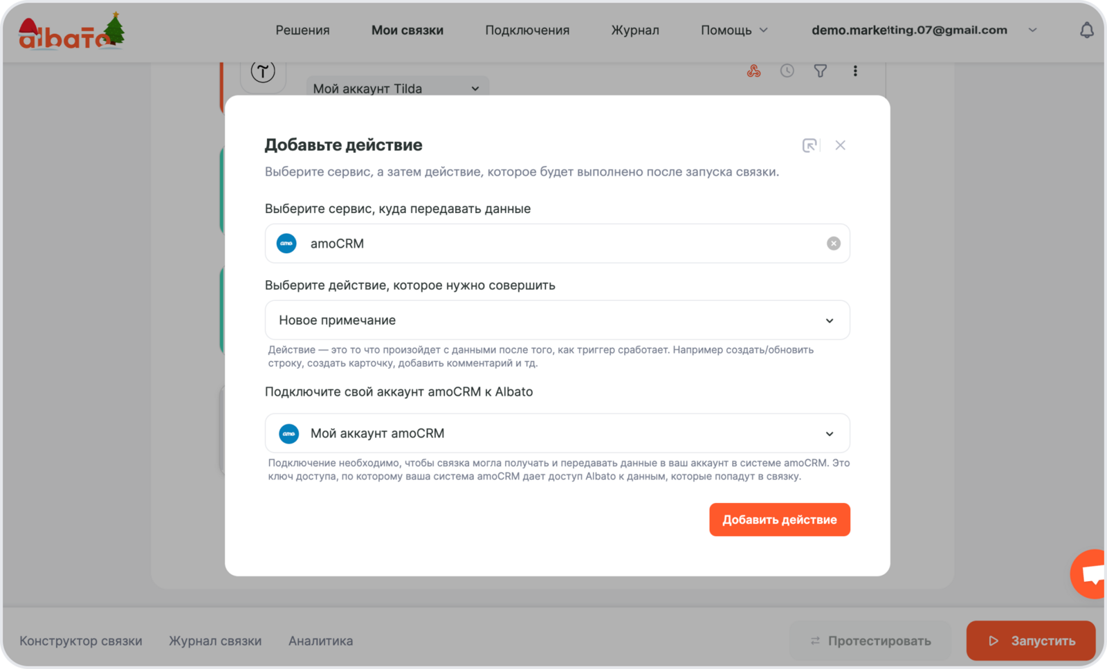Нажми **Сохранить **и добавь в связку шаг **amoCRM – Новое примечание. **