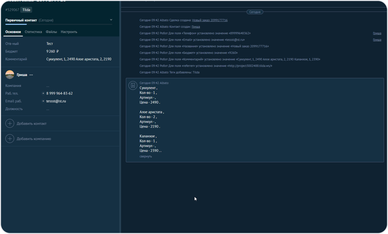 Когда клиент оставит свои данные в Tilda, они будут автоматически переданы в amoCRM. Там появится новый контакт и новая сделка с примечанием.