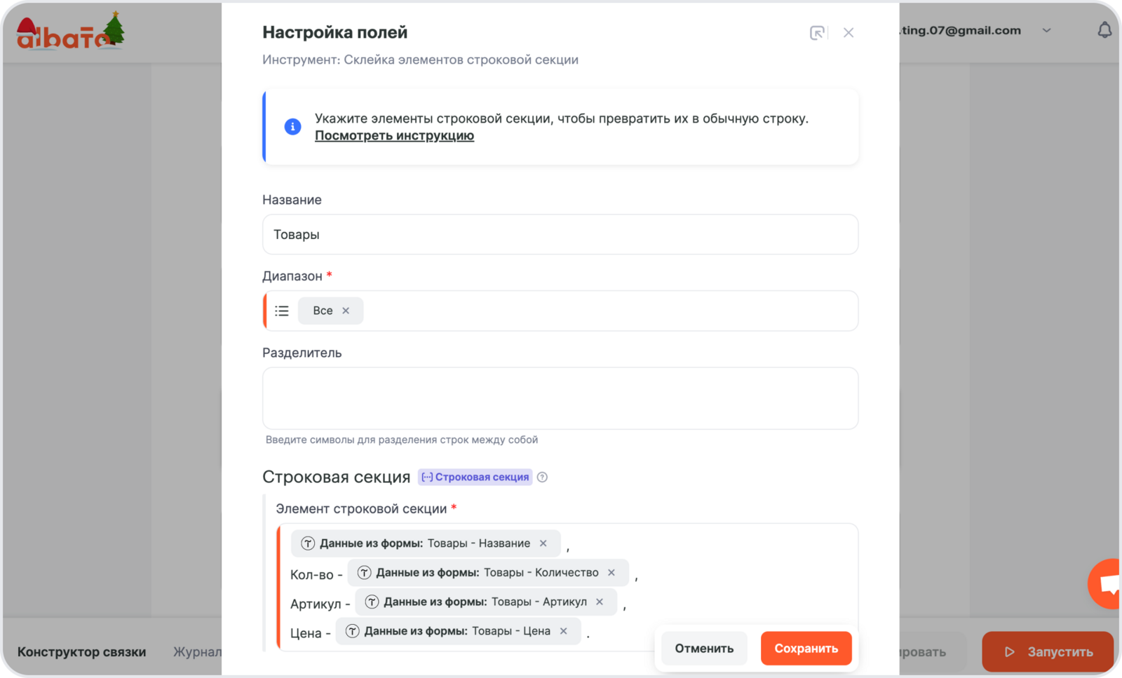 В нашем примере необходимо создавать примечание с перечнем товаров в самом заказе, для этого в связку нужно добавить инструмент – Склейка строковых секций.