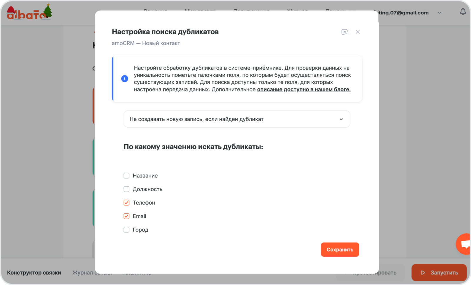 Далее откроется окно Настройки **поиска дубликатов. Из выпадающего списка выбери **Не создавать новую запись, если найден дубликат и выбери значение по которому система будет искать дубликаты – Номер телефона и Почта.