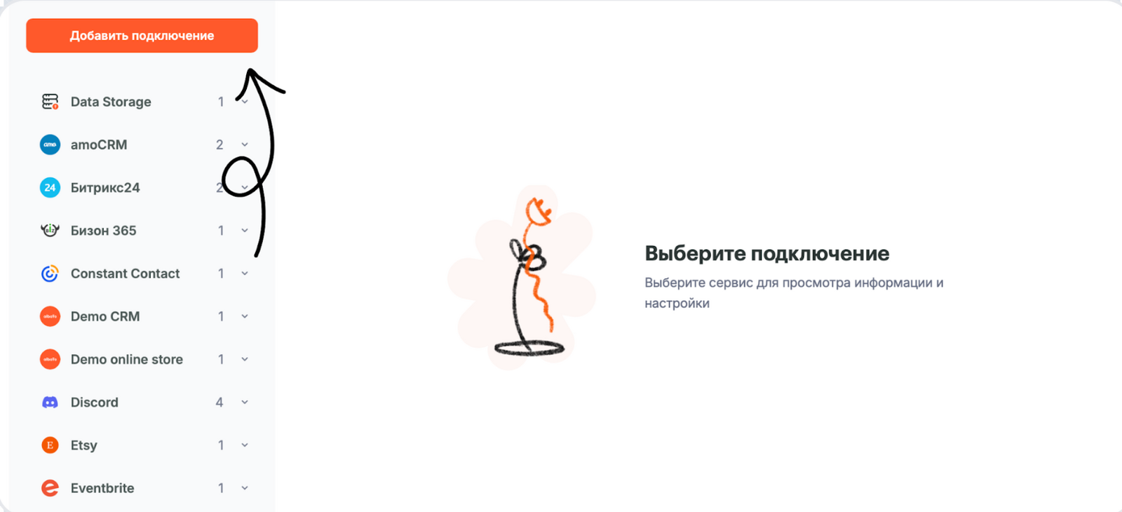 - Перейдите в раздел Подключения и нажмите Добавить подключение.