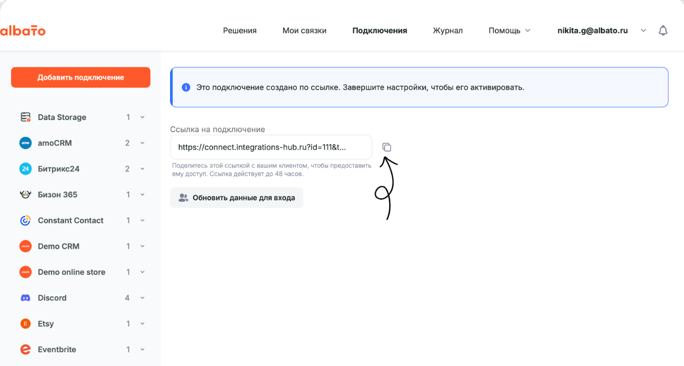 Создайте ссылку и отправьте клиенту, чтобы он мог зайти в приложение. Ему достаточно ввести данные своего аккаунта, после этого подключение появится в вашем личном кабинете Альбато. Следуйте шагам в этой инструкции.