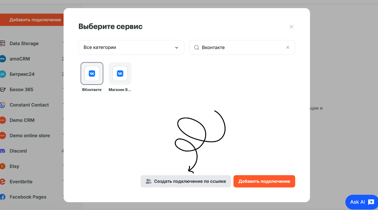 - Выберите нужное вам приложение. Нажмите Создать подключение по ссылке.