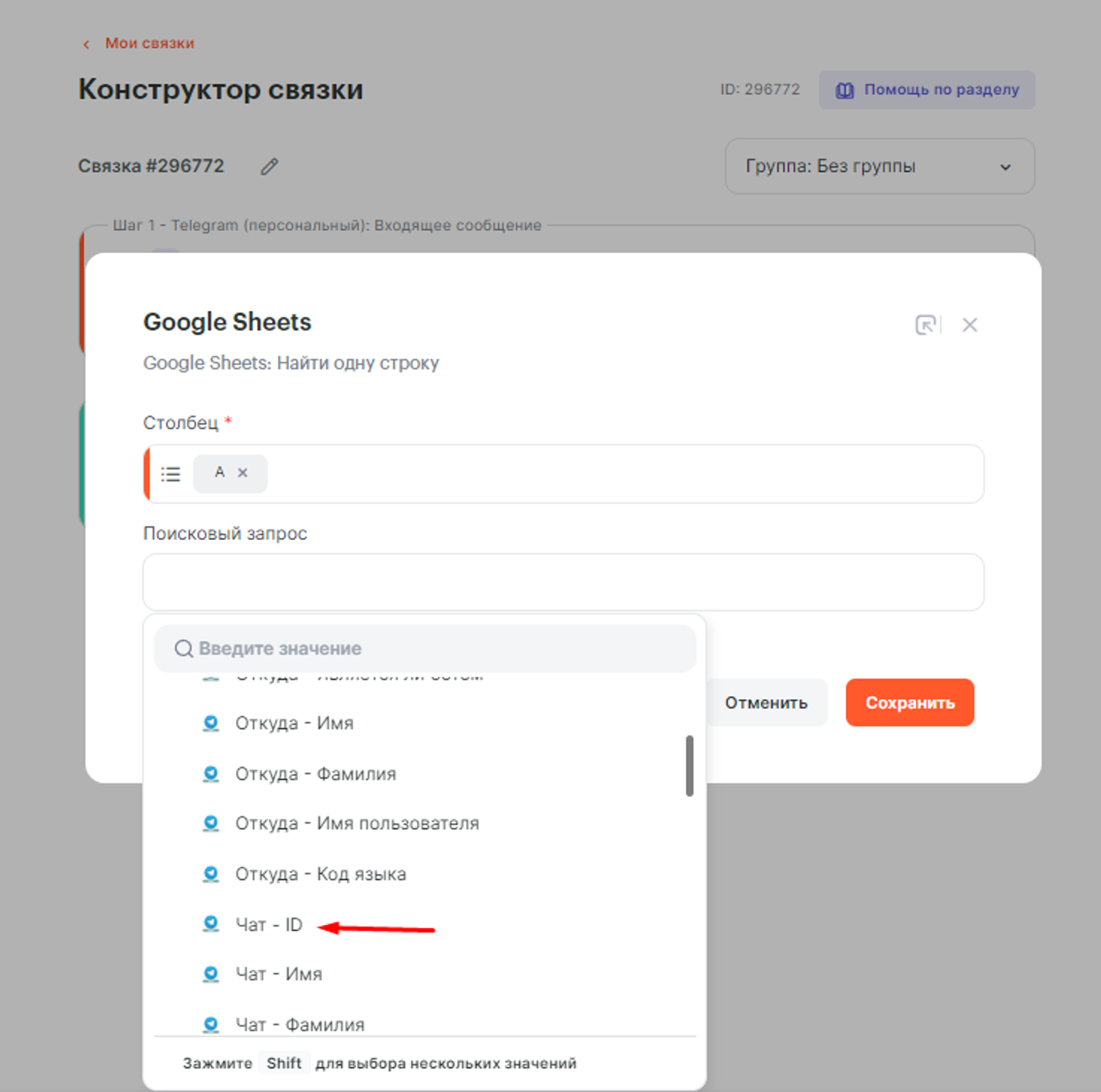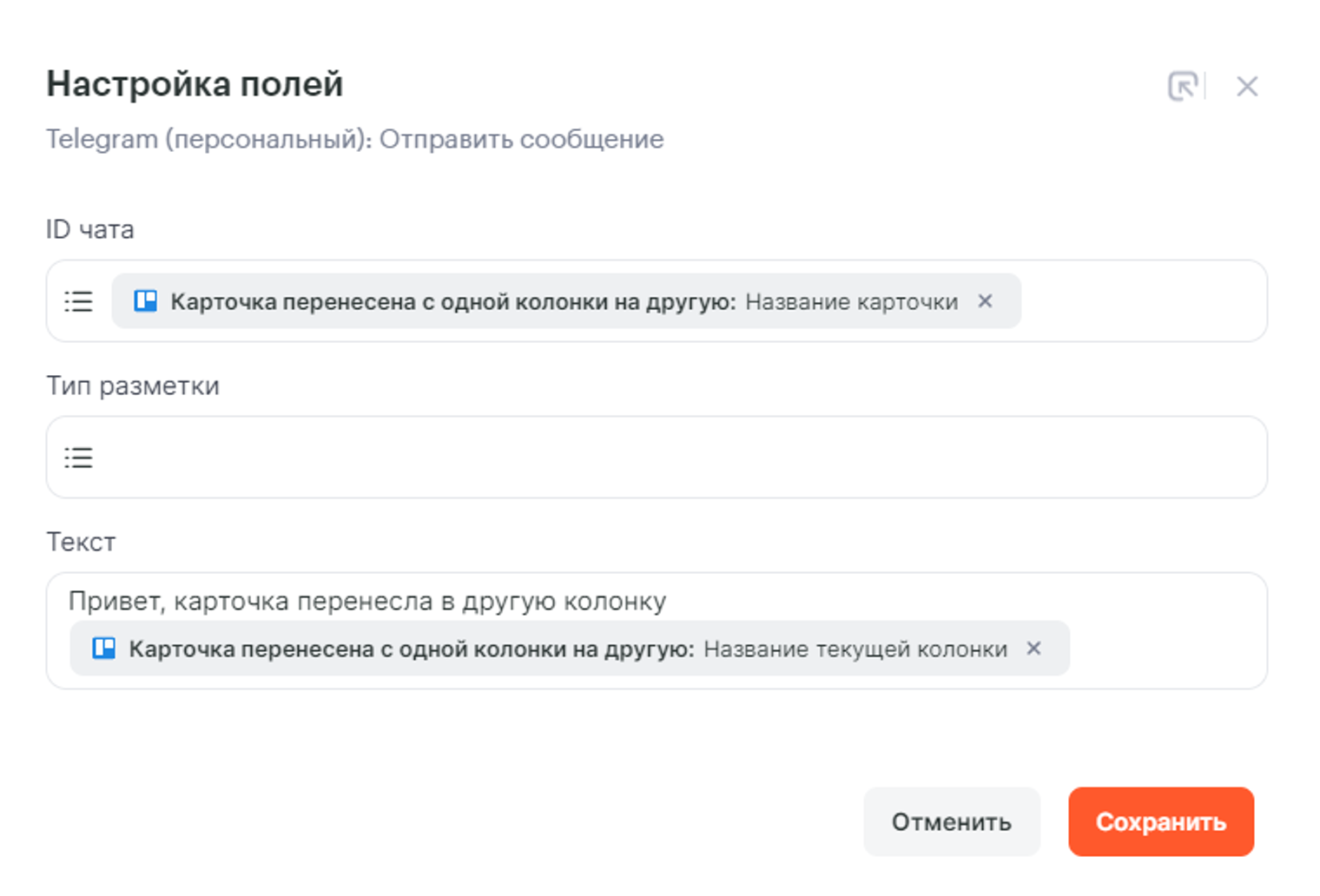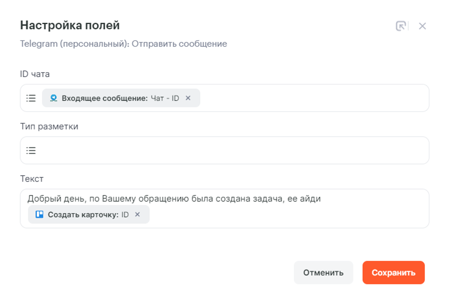 В названии карточки будем использовать параметр ID чата от первого шага Telegram (персональный):