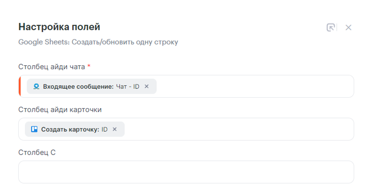 - Google Sheets: Создать/обновить одну строку, используем ту же таблицу и лист, что и на шаге 2