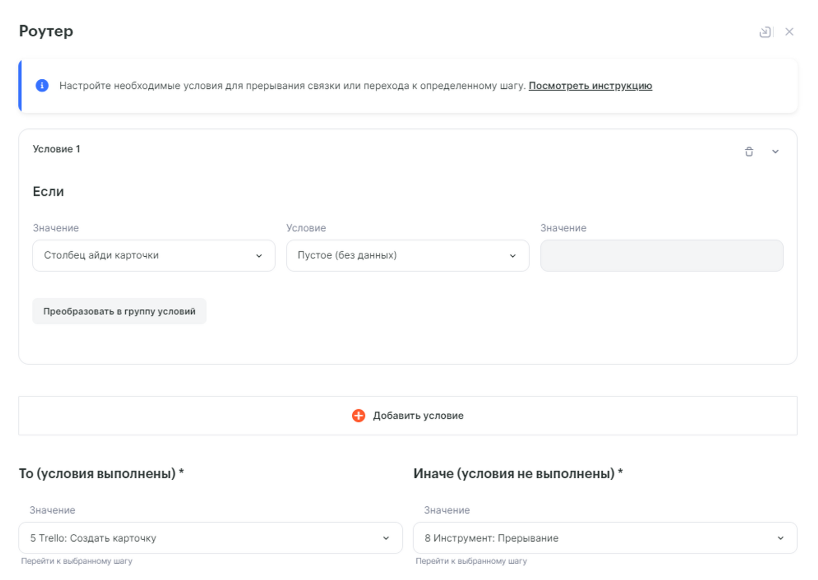 Переходим к его настройке, нужно указать условие разветвления, в нашем случае: столбец содержащий ID карточки из Trello будет пустой: