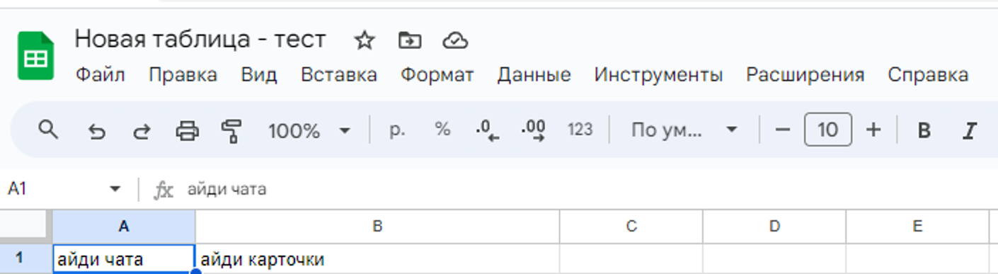 Сообщения от одного и того же пользователя могут приходит несколько раз, будем использовать Google Sheets (таблицы) как хранилище данных. Для того на листе, где будут храниться ID чатов и ID карточки создаем шапку: