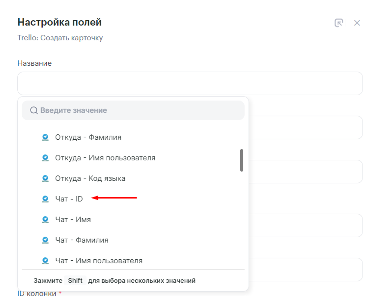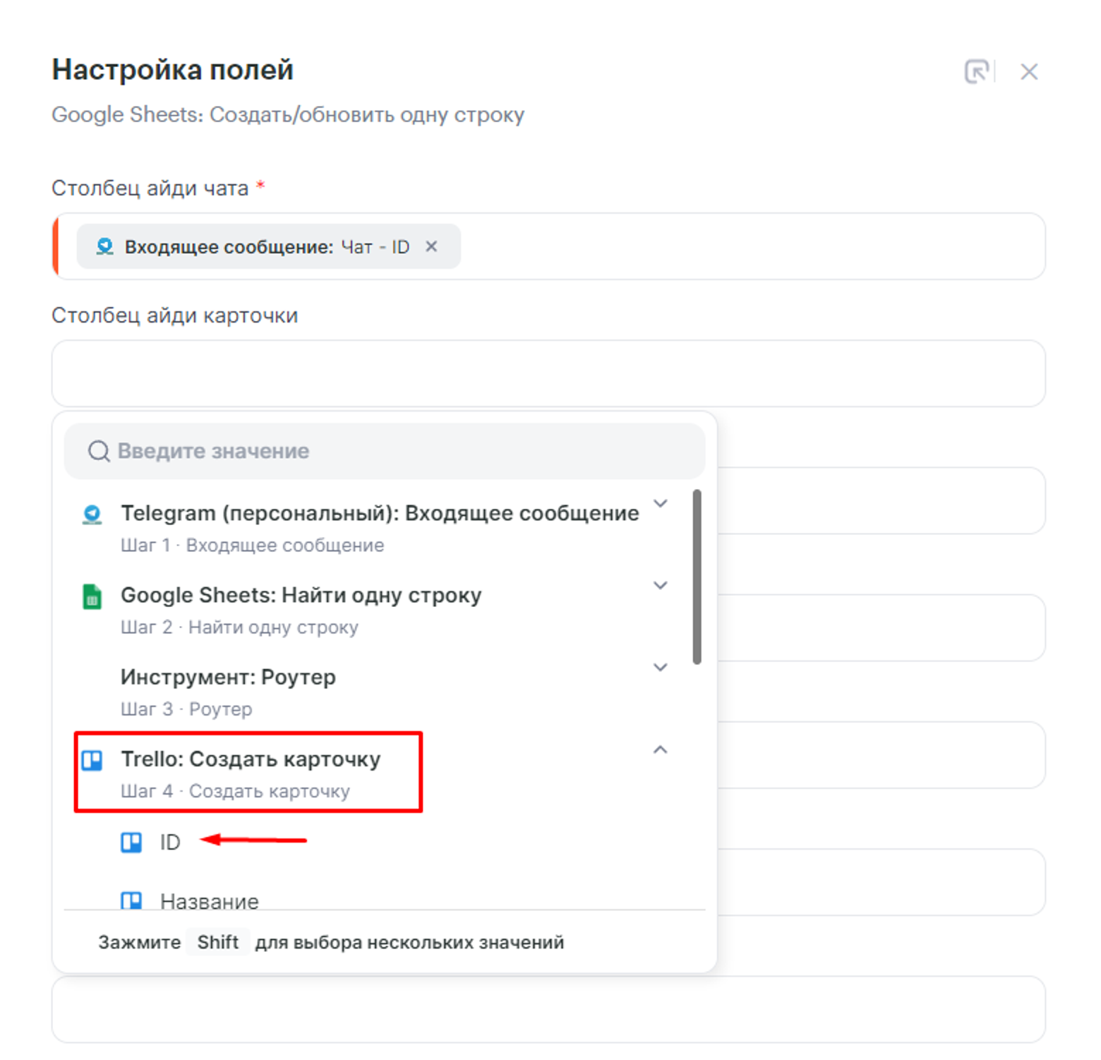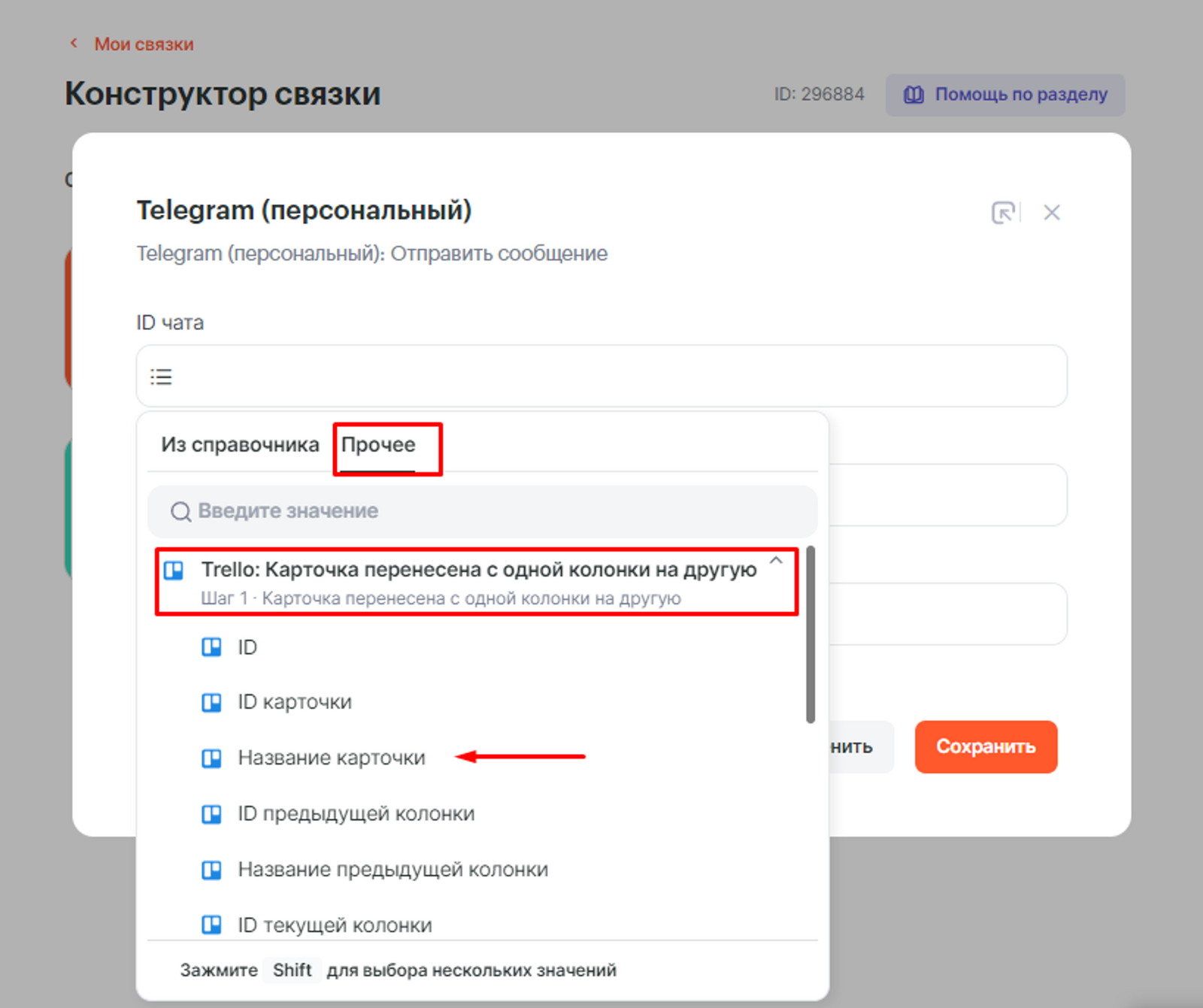 - ID чата — указываем параметр Название карточки из Trello