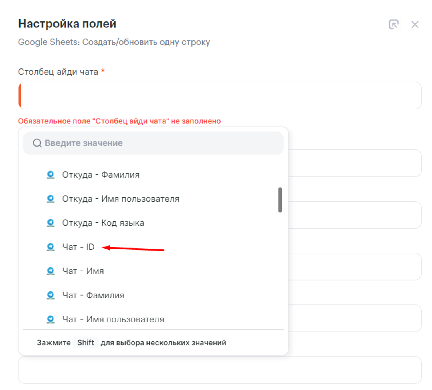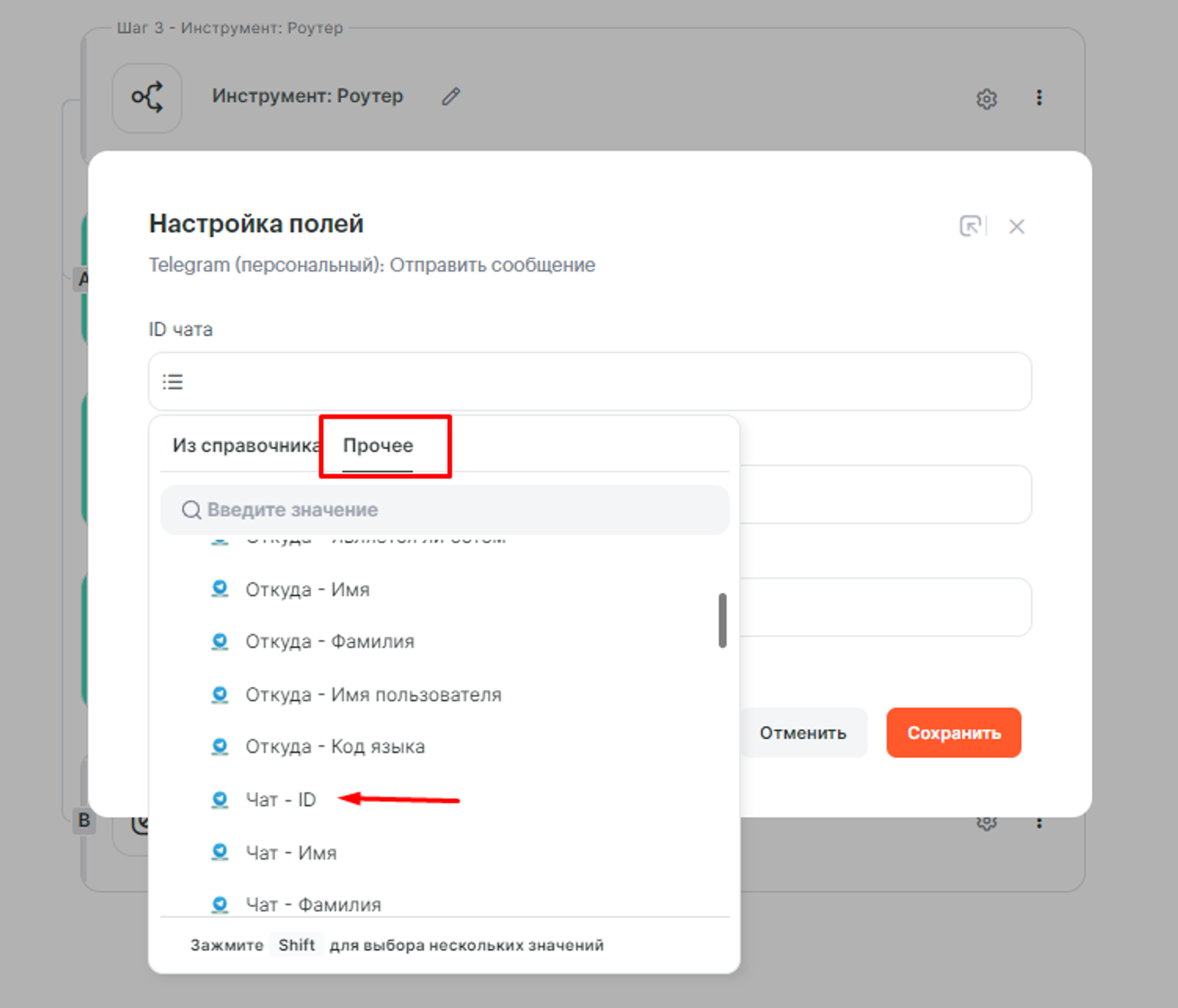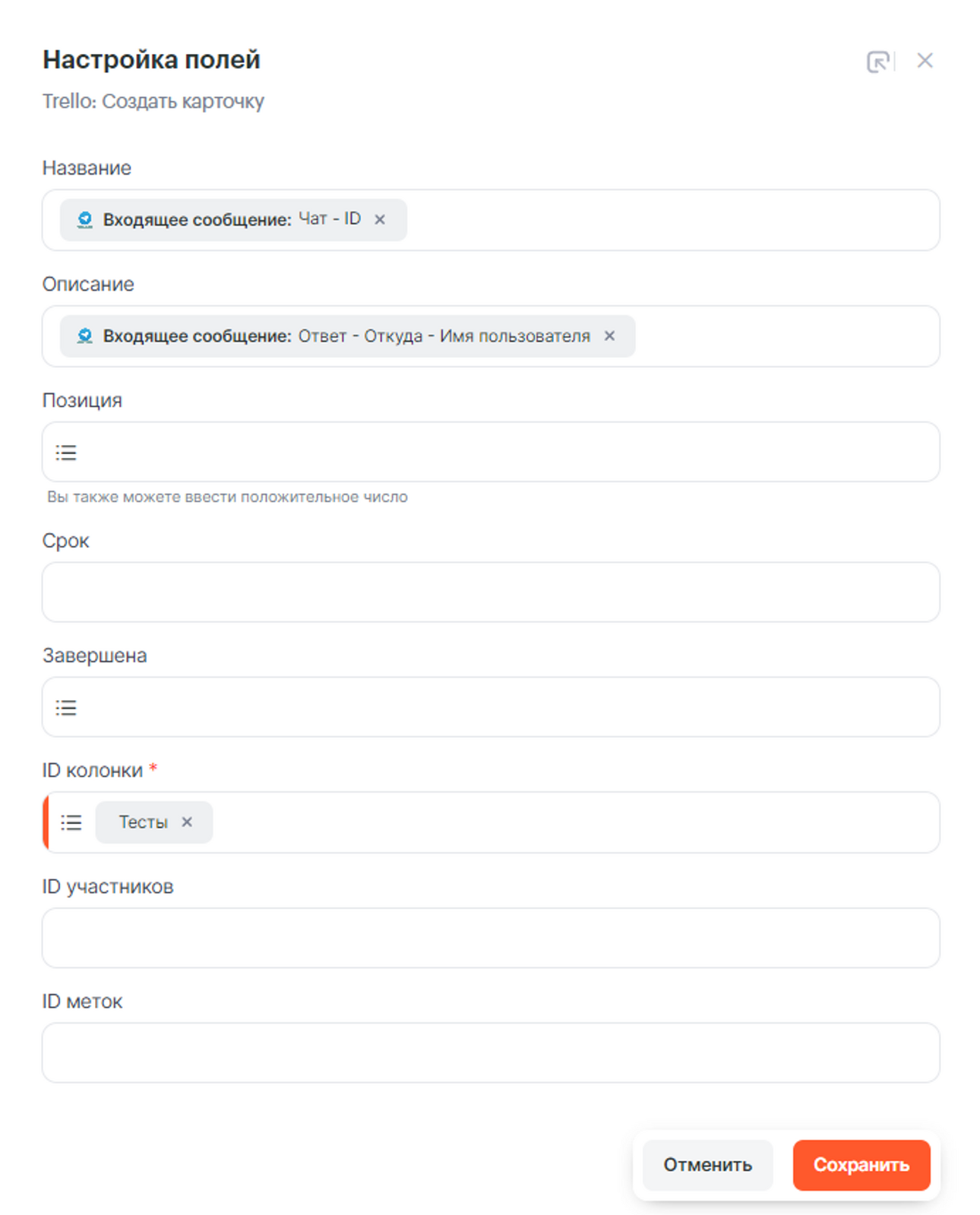 - ID чата — указываем параметр Название карточки из Trello