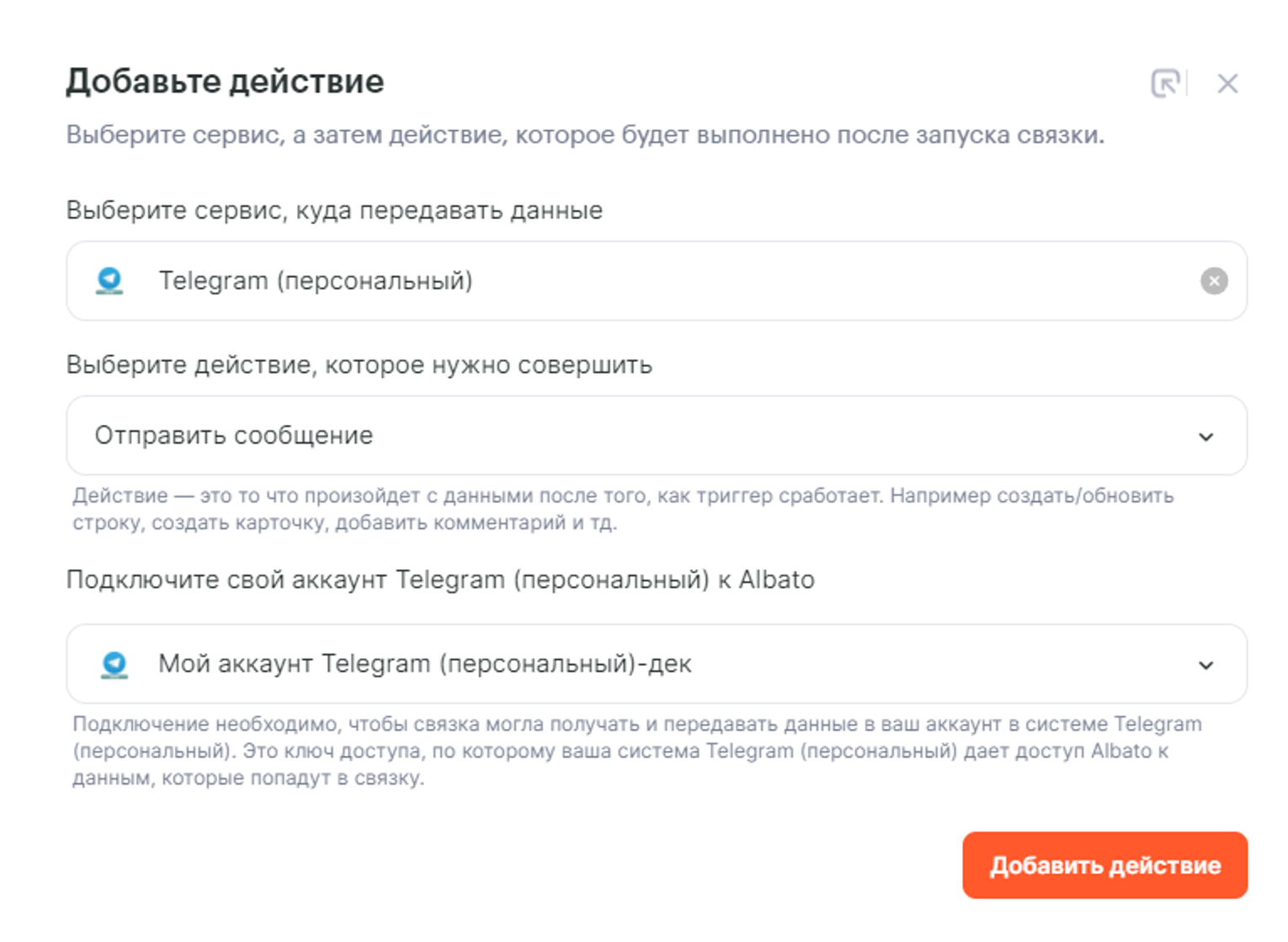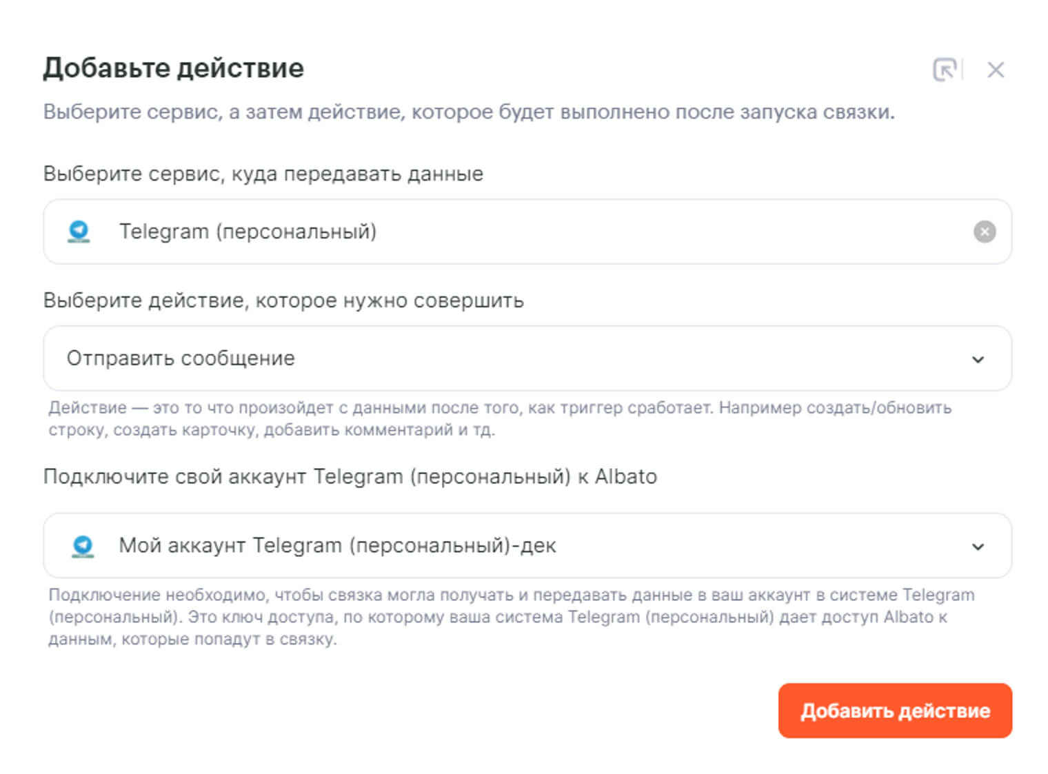 - Telegram (персональный): Отправить сообщение