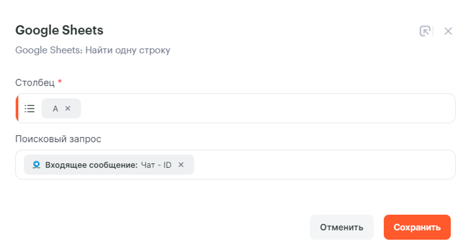 - столбец А — параметр ID чата от первого шага