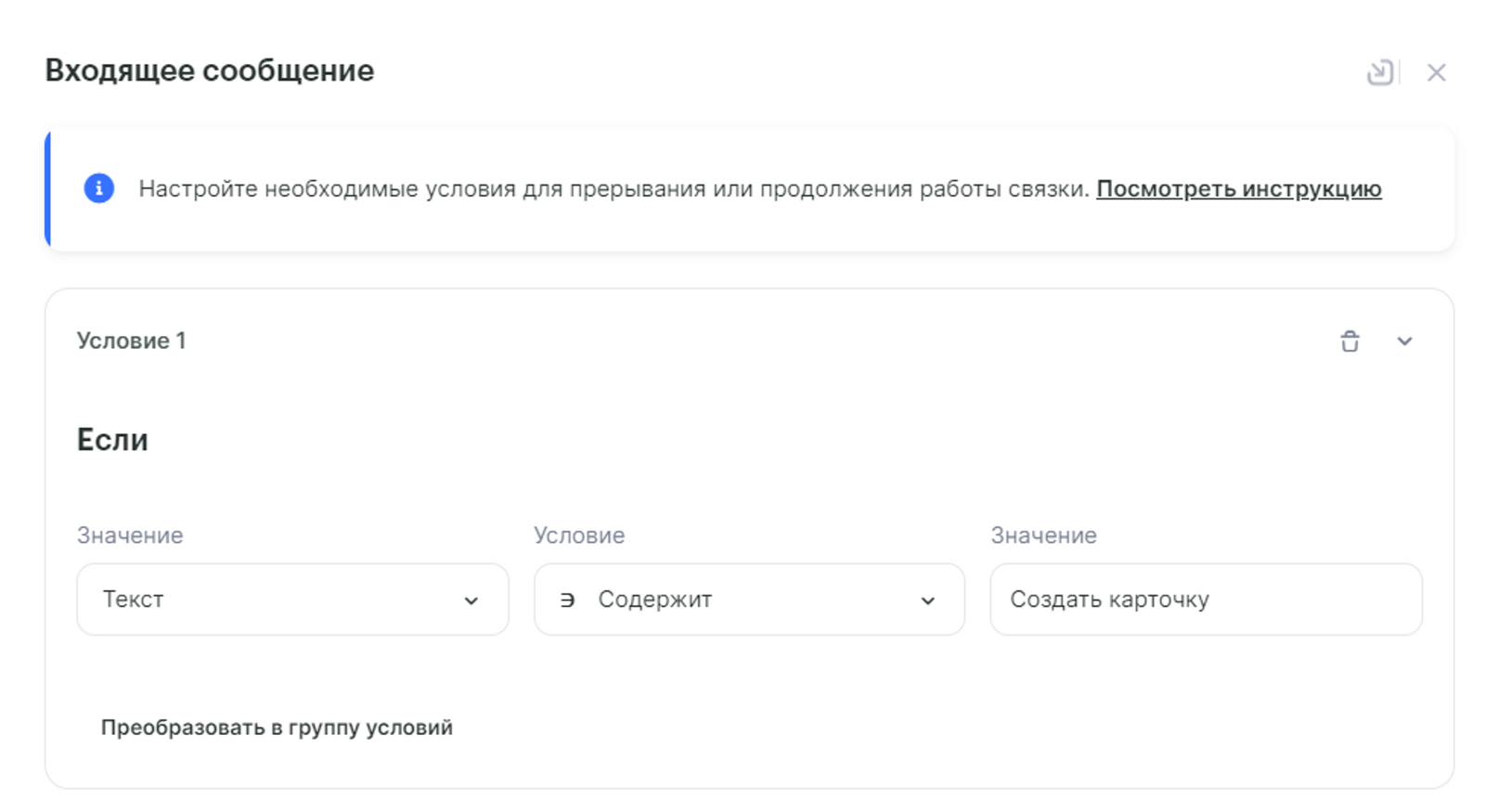 По нашей задаче карточка в Trello должна создаваться по ключевому слову, отправленному в чате, как пример будет Создать карточку. Для этого нужно поставить фильтр: