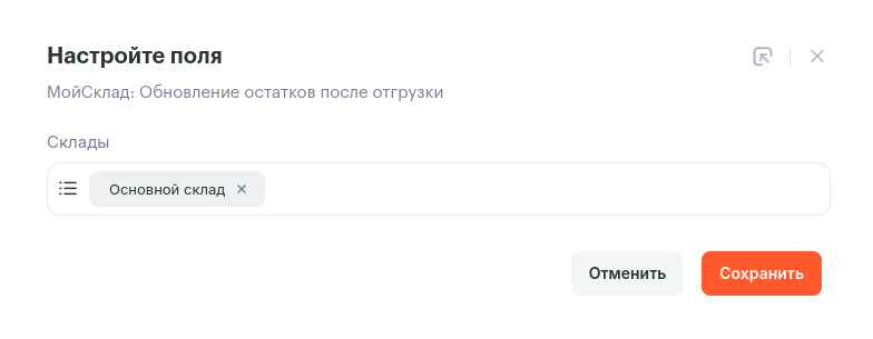 Создайте новую связку и добавьте триггер МойСклад «Обновление остатков после отгрузки». После этого, нажмите на триггер и выберите склад или склады, по которым нужно получать информацию.