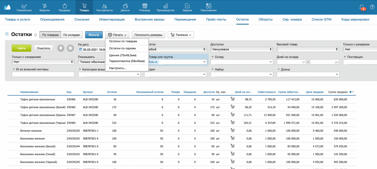Сначала нужно единоразово создать файл с остатками, которые хотим обновлять далее. Сделать это можно в разделе «Товары» => «Остатки». Задайте условие выгрузки по складам и скачайте файл в формате .xls с помощью кнопки «Печать» => «Остатки по товарам».