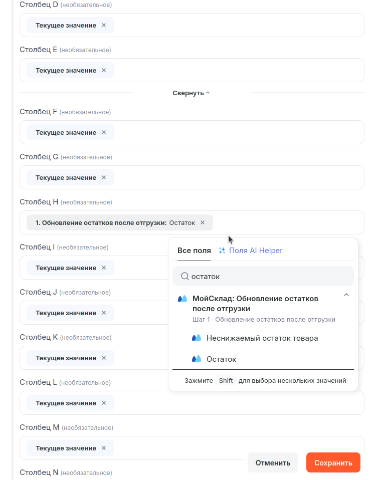 В открывшемся окне настроек выберите столбец, в котором нам нужно обновить значение у найденной позиции. У меня это столбец H c остатками. Вставьте в это поле соответствующее значение из предыдущего шага – у меня это «Остаток». Нажмите на кнопку “Сохранить”.