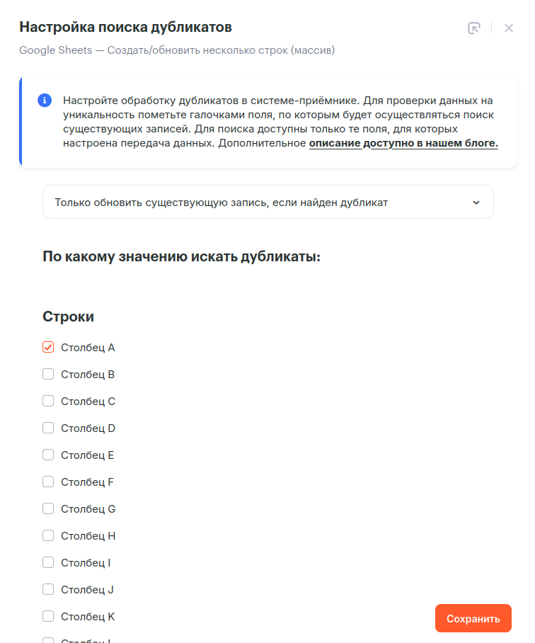 Выберите «Только обновить существующую запись, если найден дубликат», а в списке столбцов укажите тот, по которому идет поиск. Нажмите на кнопку “Сохранить”.