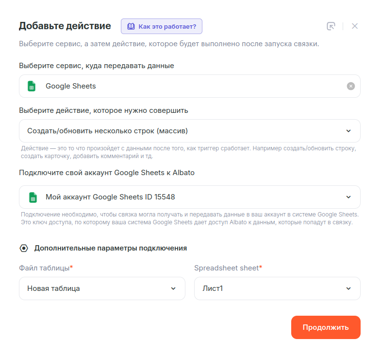 Экшны и настройки будут для всех одинаковыми. Google Sheets – «Создать/обновить несколько строк (массив)». Настройки разберем на примере одной связки: МойСклад «Обновление остатков после отгрузки».