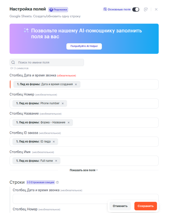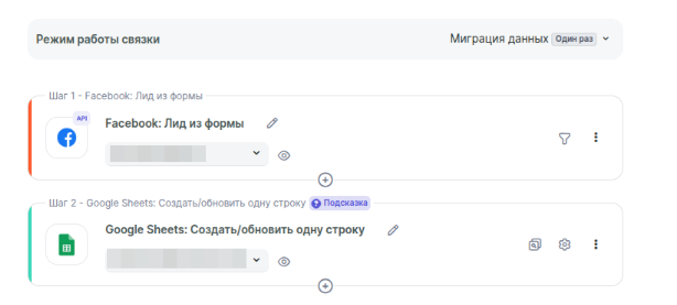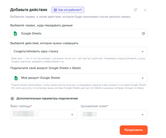 - Какое действие выполнить, когда запустится связка — Создать/обновить одну строку