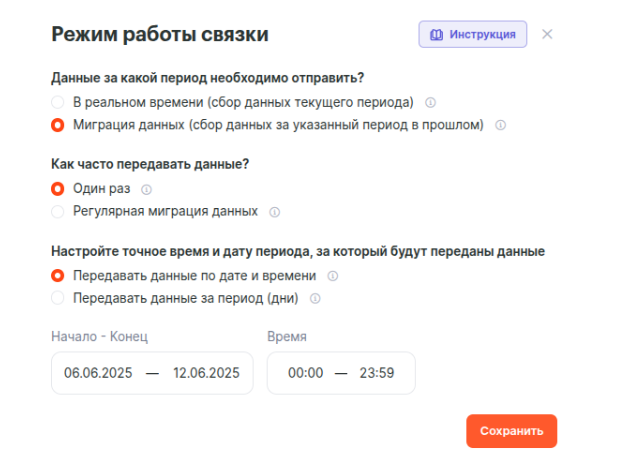 - Получить данные, которые еще не были собраны, если по каким-то причинам перестали работать связки. В этом случае есть возможность выгрузить данные за тот отрезок времени, в который связки не работали.