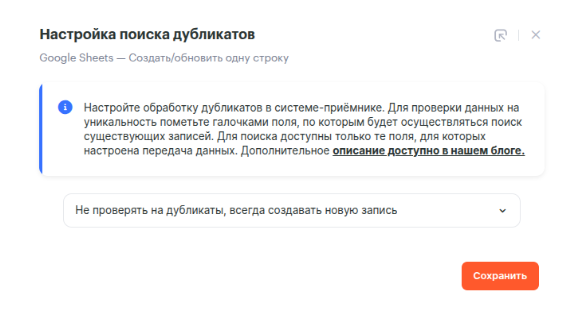 Останется выбрать правило обработки дублей. Каждый новый лид — уникальная сущность, поэтому выберите «всегда создавать новую запись».