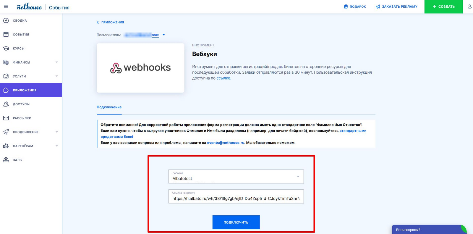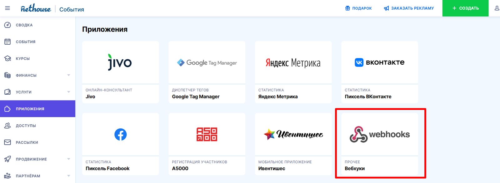 Переходим в сервис Nethouse.События, заходим во вкладку Приложения, выбираем webhooks