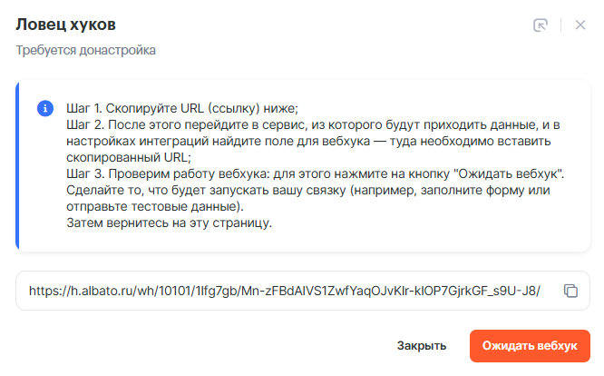 После нажатия кнопки «Далее» будет сгенерирован URL вебхука, который нужно скопировать.