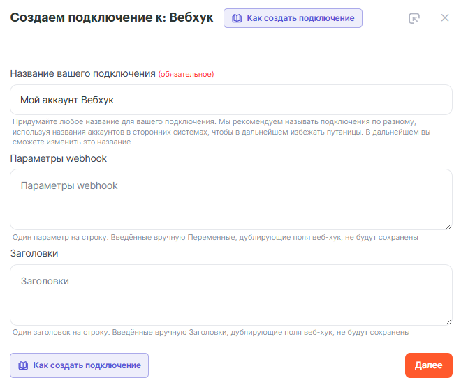 Параметры webhook и Заголовки на данном этапе можно не заполнять. При необходимости к этому можно вернуться позже в уже созданном Подключении.