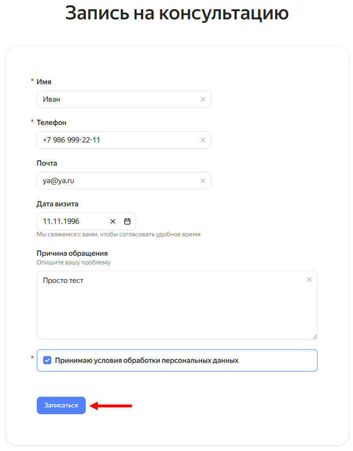 После этого нужно перейти в сервис, из которого планируем получать данные (в нашем примере Яндекс.Формы) и тестово заполняем все поля формы и нажимаем отправку.