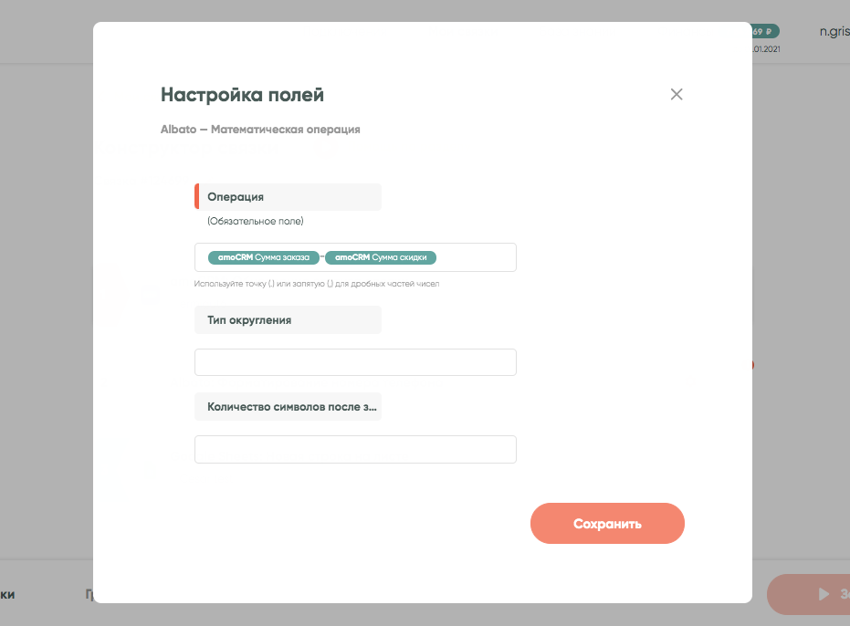 В нашем примере в первое поле сначала нужно вставить параметр от амоCRM «сумма заказа», затем минус и второй параметр — «сумма скидки». После заполнения полей нажмите на кнопку «Сохранить»: