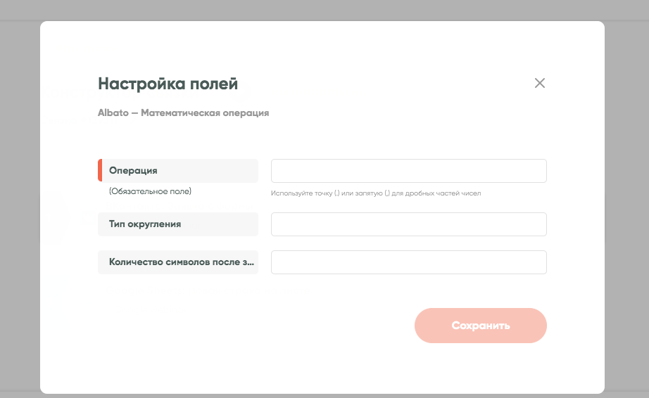 Опишите математическую операцию в первом поле. Если результат будет дробным, во втором поле выберите тип округления. В третьем поле можно написать количество символов после нуля: