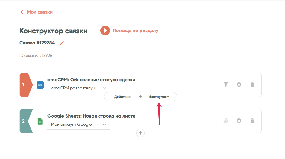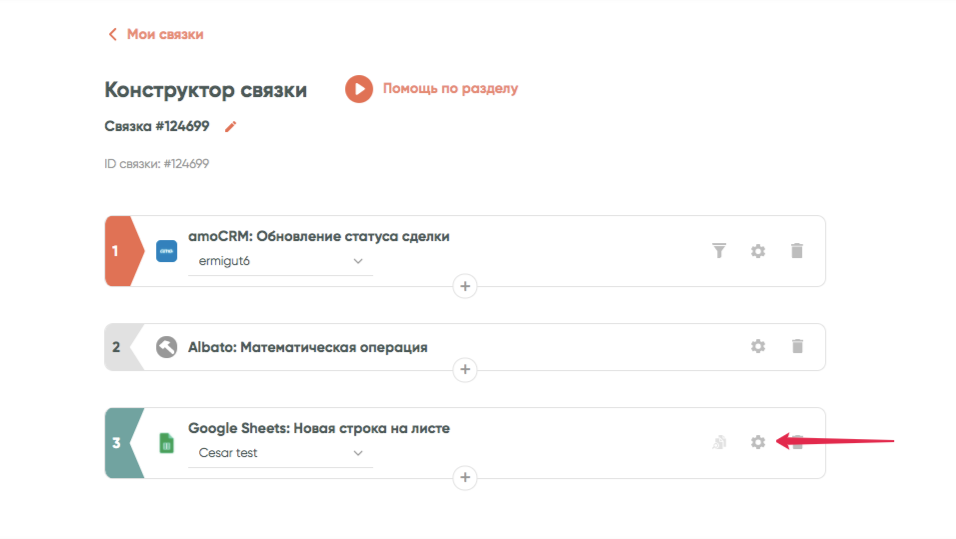 Откройте окно настроек следующего шага, в примере это Google Таблицы:
