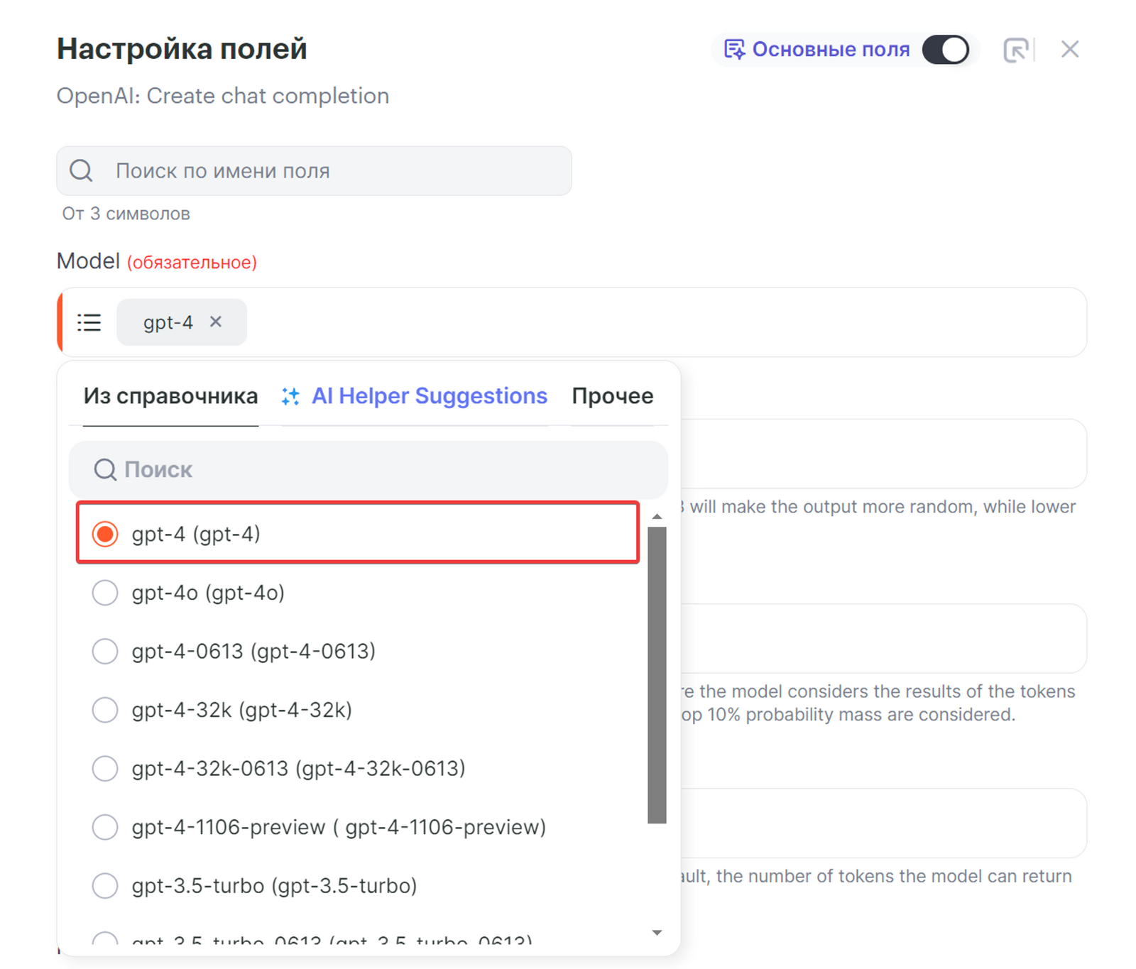 - В поле Model выбираем из предложенного списка модель OpenAI, которую будем использовать в связке — gpt-4