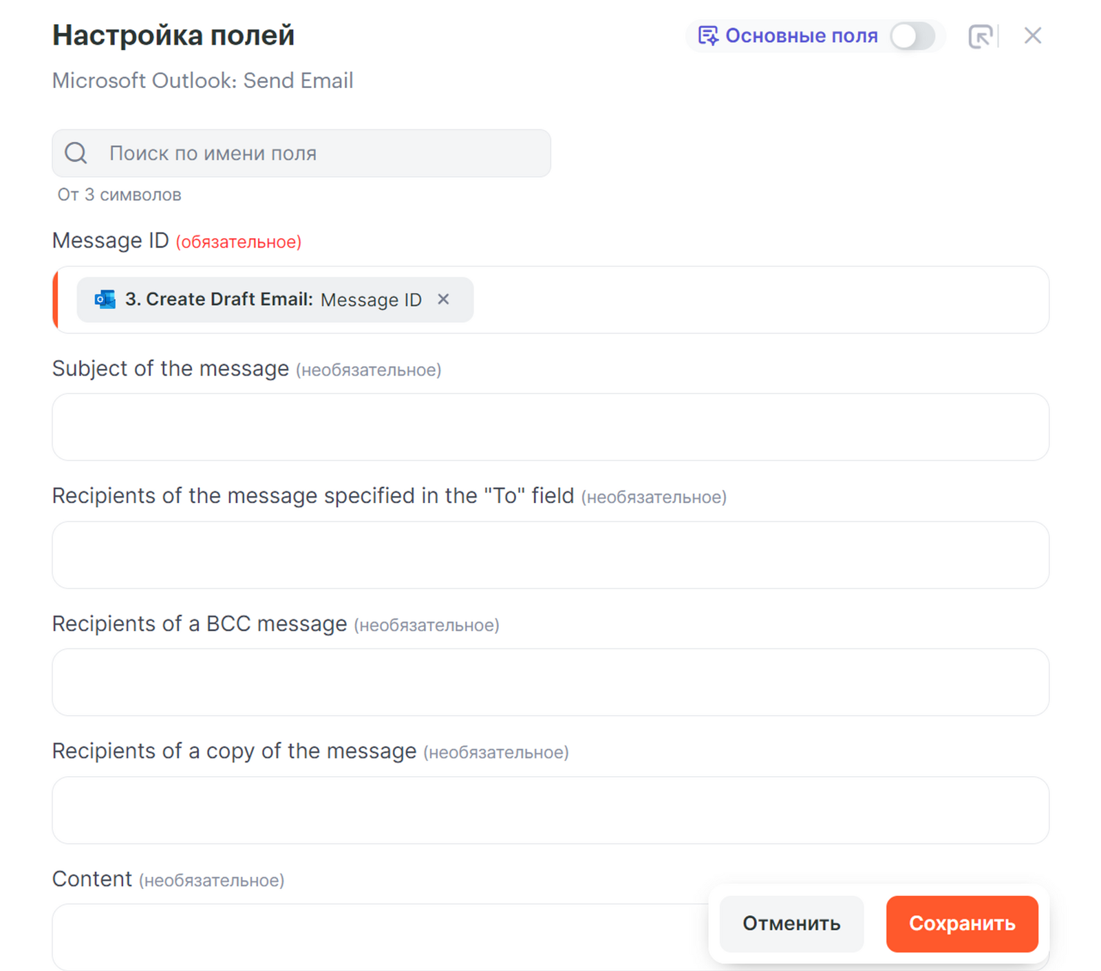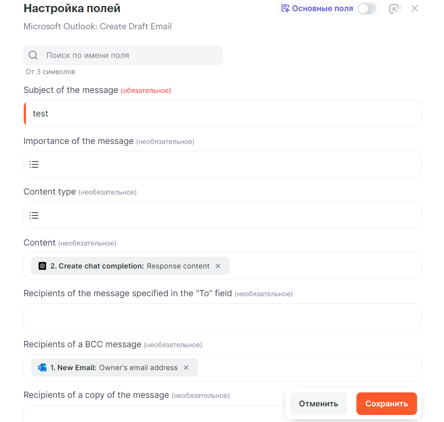 - Выберите действие – Create Draft Email (из-за особенности Microsoft Outlook перед отправкой письма необходимо создавать черновик, а после отправлять его получателю (шаг 4))