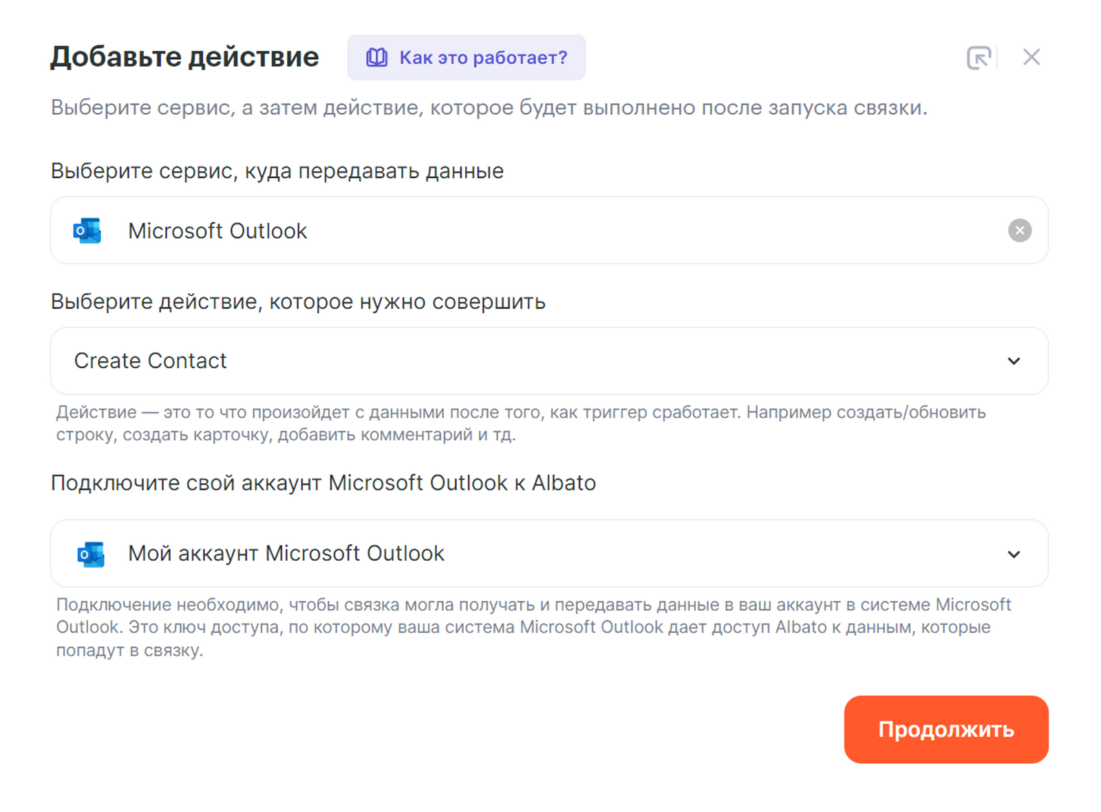 - Выберите сервис, куда будете передавать данные – Microsoft Outlook