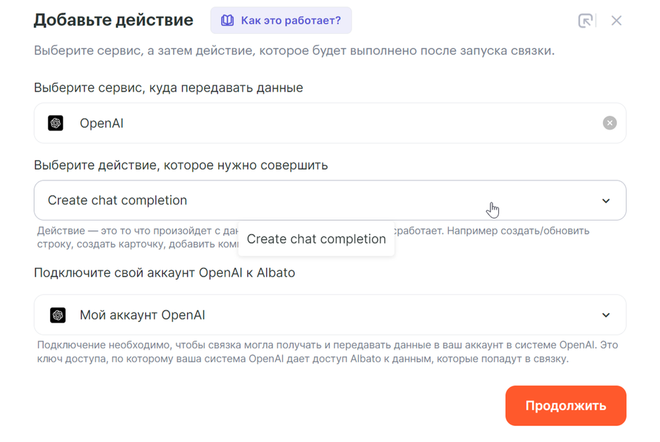 - Выберите сервис, куда будете передавать данные – OpenAI