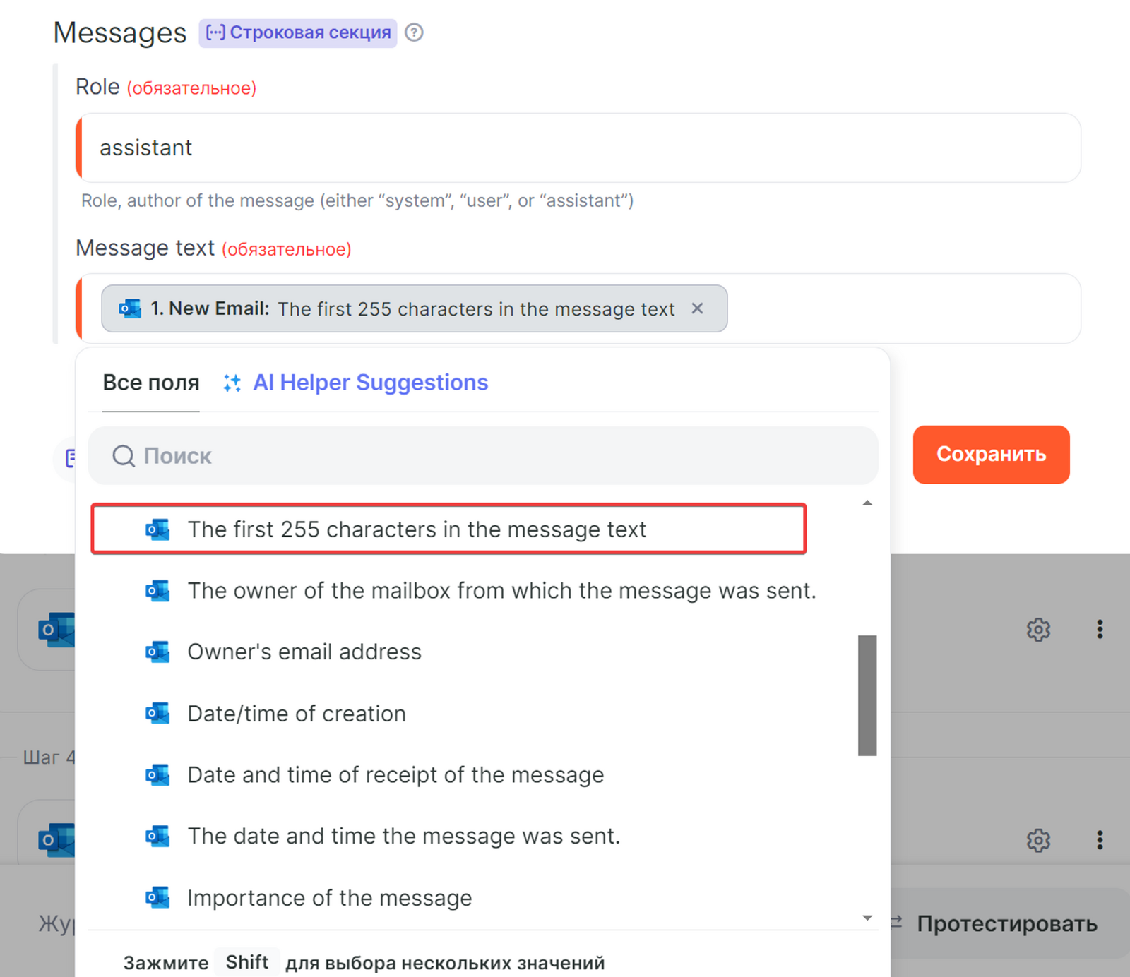 - В поле Role необходимо указать роль автора сообщения, который будет автоматически отвечать на входящие письма (”system”, “user”, “assistant”)