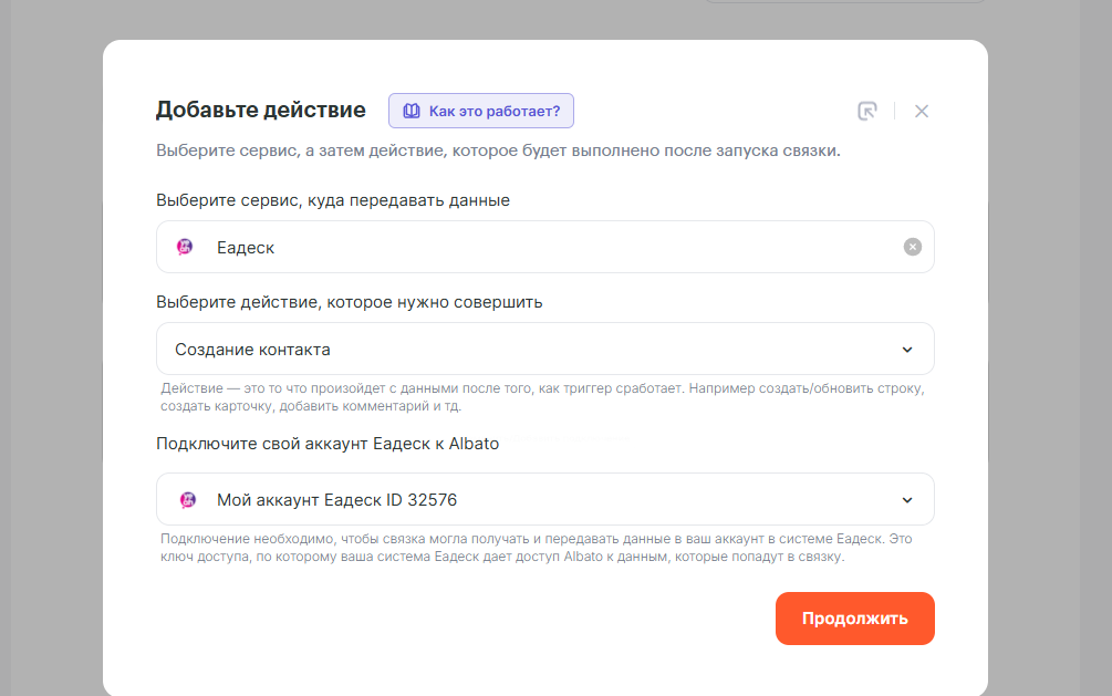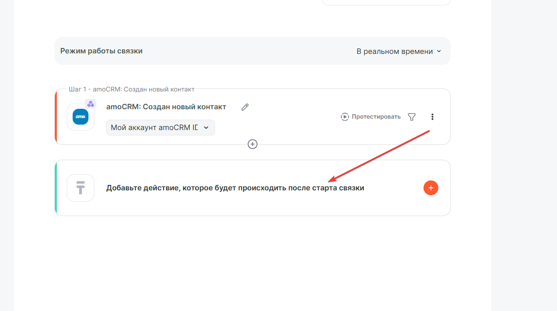 - Какое действие выполнить, когда запустится связка — Создание контакта.