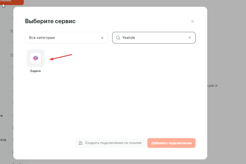 Зайди в раздел «Подключения», нажми на кнопку «Добавить подключение» и выбери из списка «Yeahdesk».