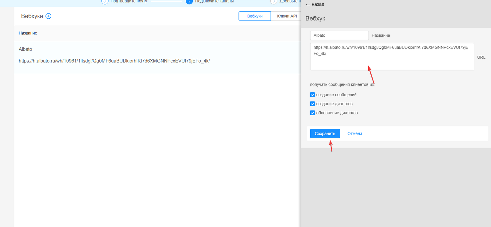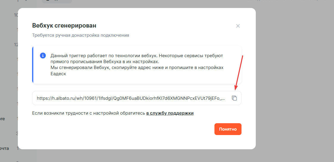 Теперь скопируйте полученный в Альбато вебхук