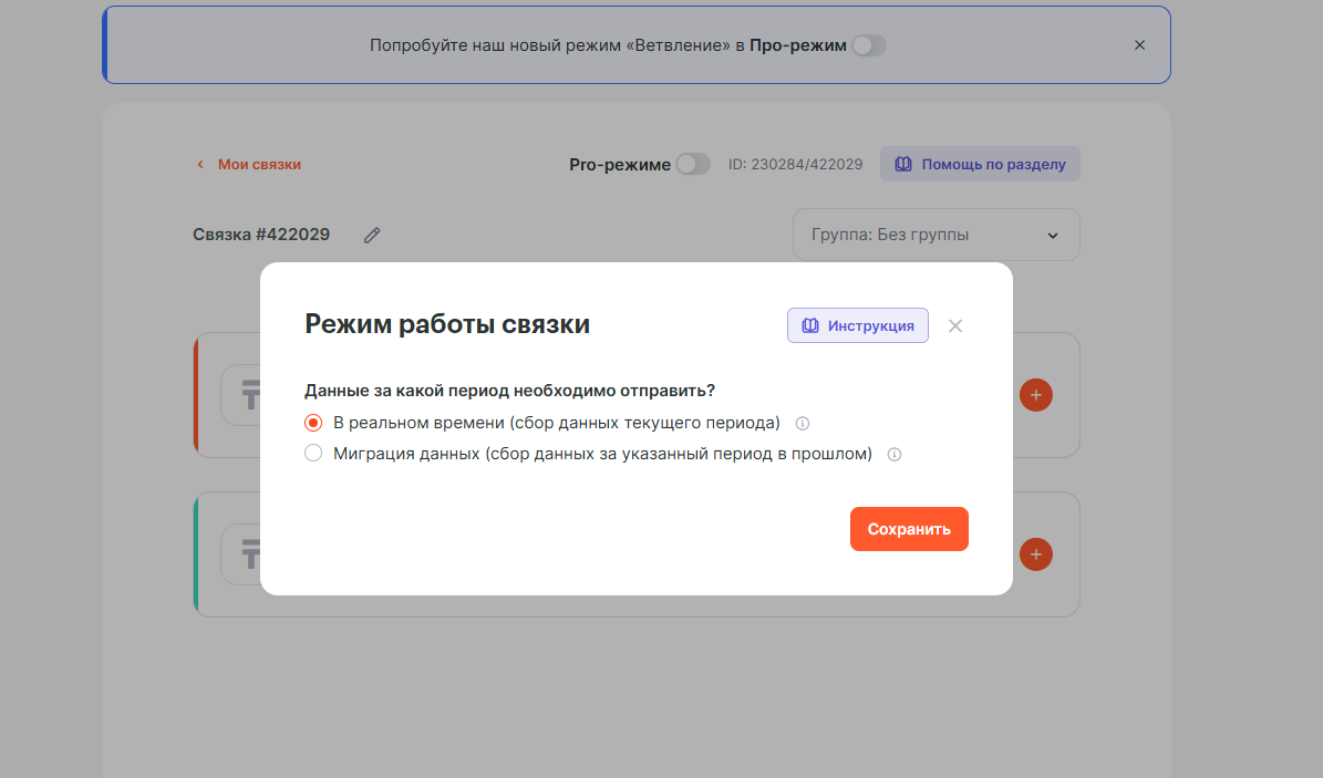 Выбери режим работы связки — В реальном времени, нажми Сохранить