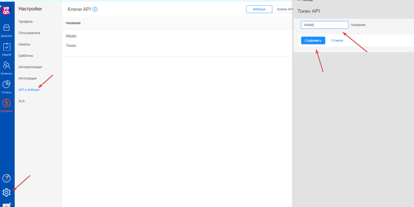 Чтобы получить Access token в Yeahdesk перейди в Настройки, раздел API и Вебхук, нажми — Создать новый ключ, введи его название и нажми Сохранить.