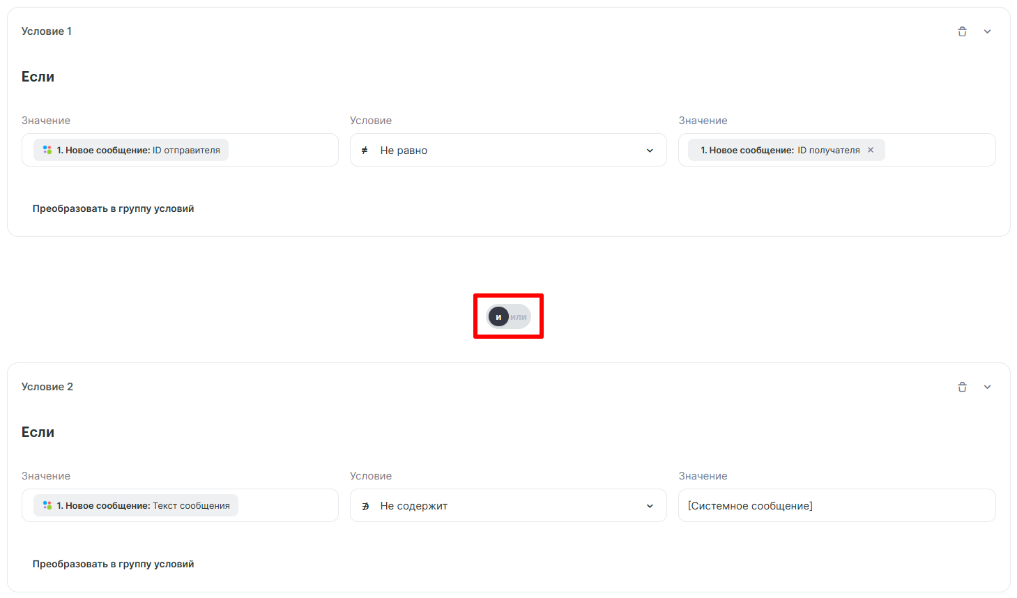 «Текст сообщения» → Не содержит → [Системное сообщение]