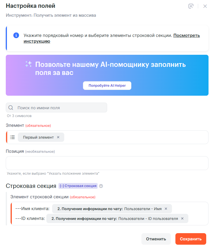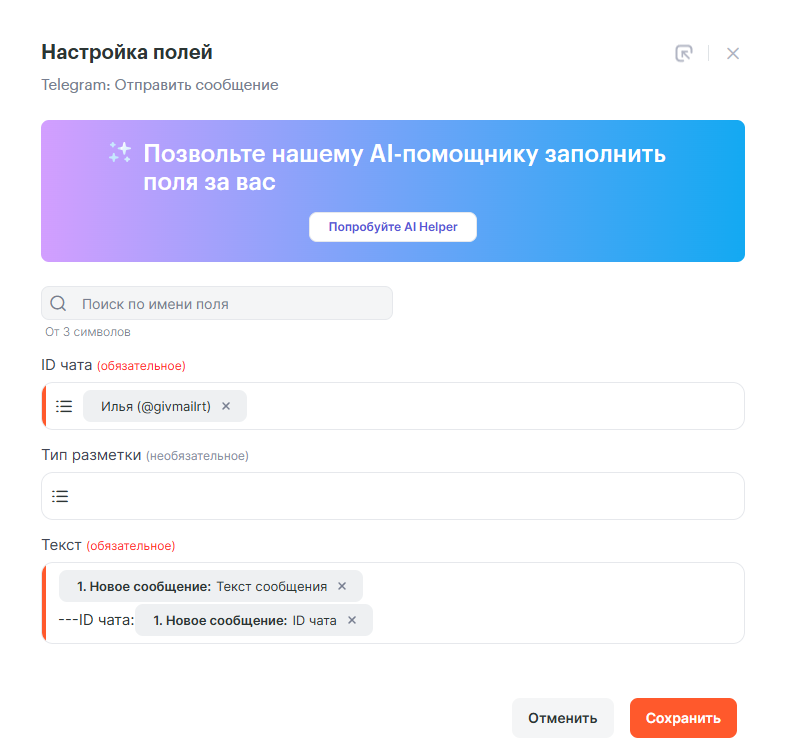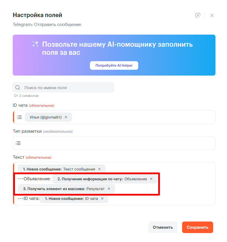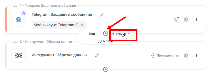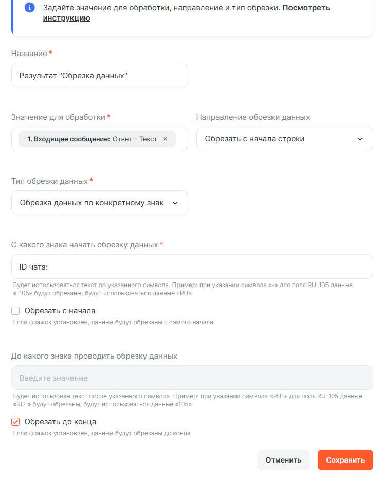 - ID чата — выбираем Результат инструмента Инструмента: Обрезка данных