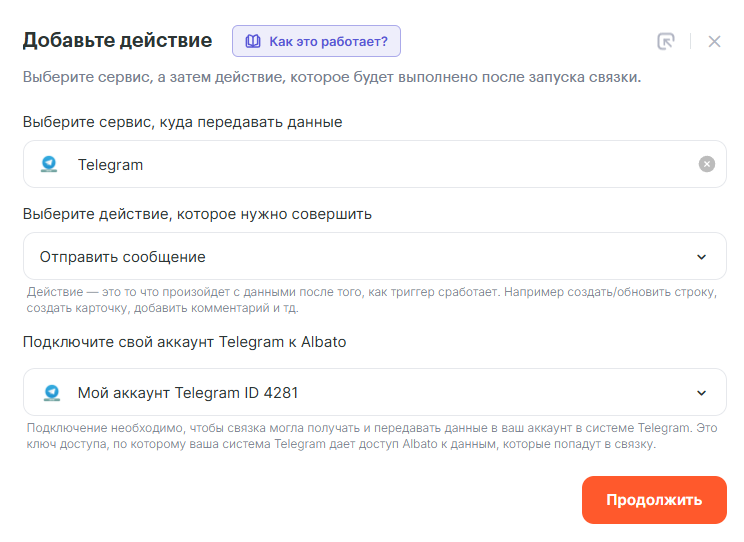 - Сервис, куда передавать данные — Telegram
